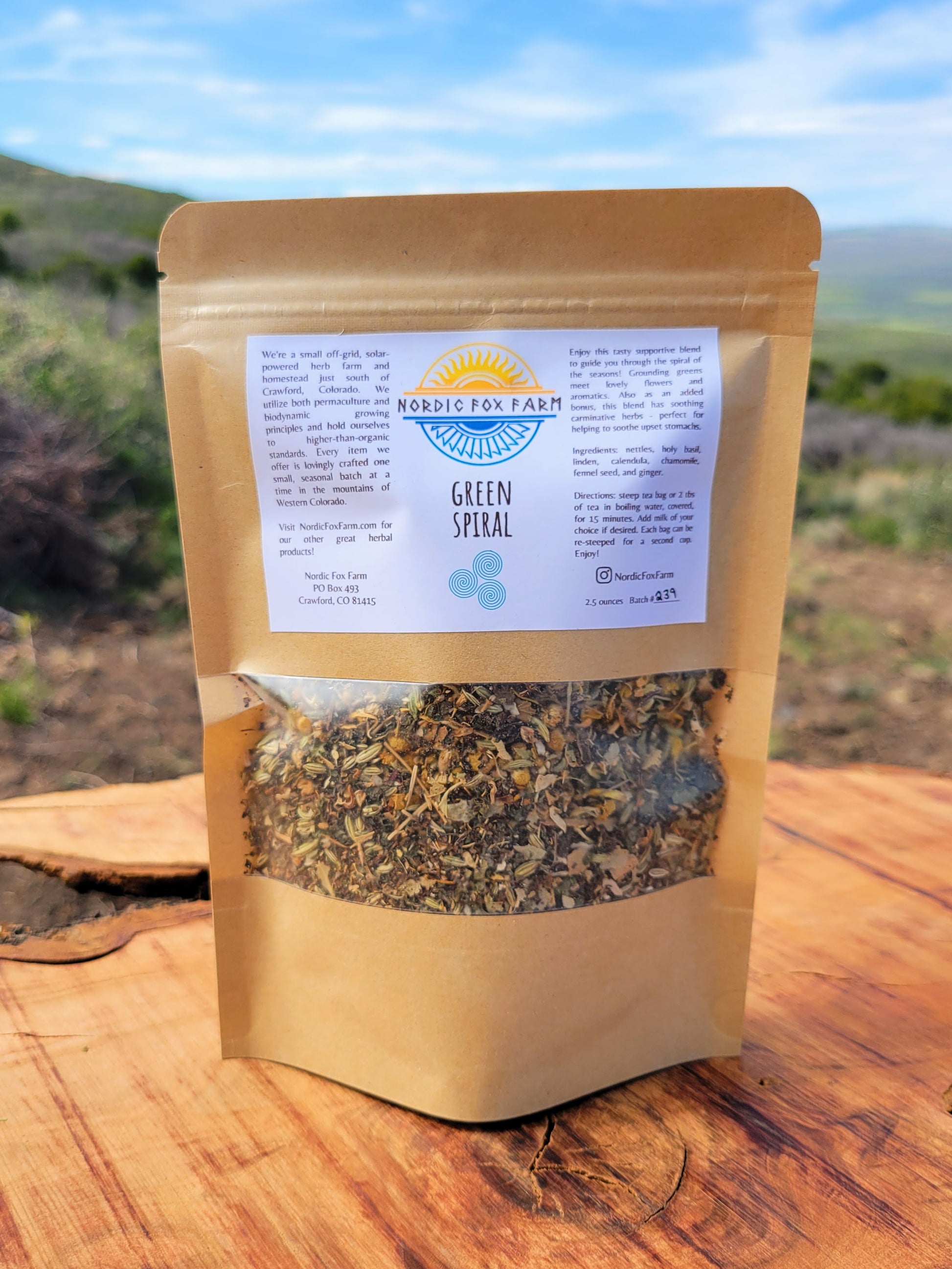 Enjoy this tasty supportive blend to guide you through the spiral of the seasons! Grounding greens meet lovely flowers and aromatics. Also as an added bonus, this particular blend has some soothing carminative herbs - perfect for when I've overindulged or have an unsettled stomach.