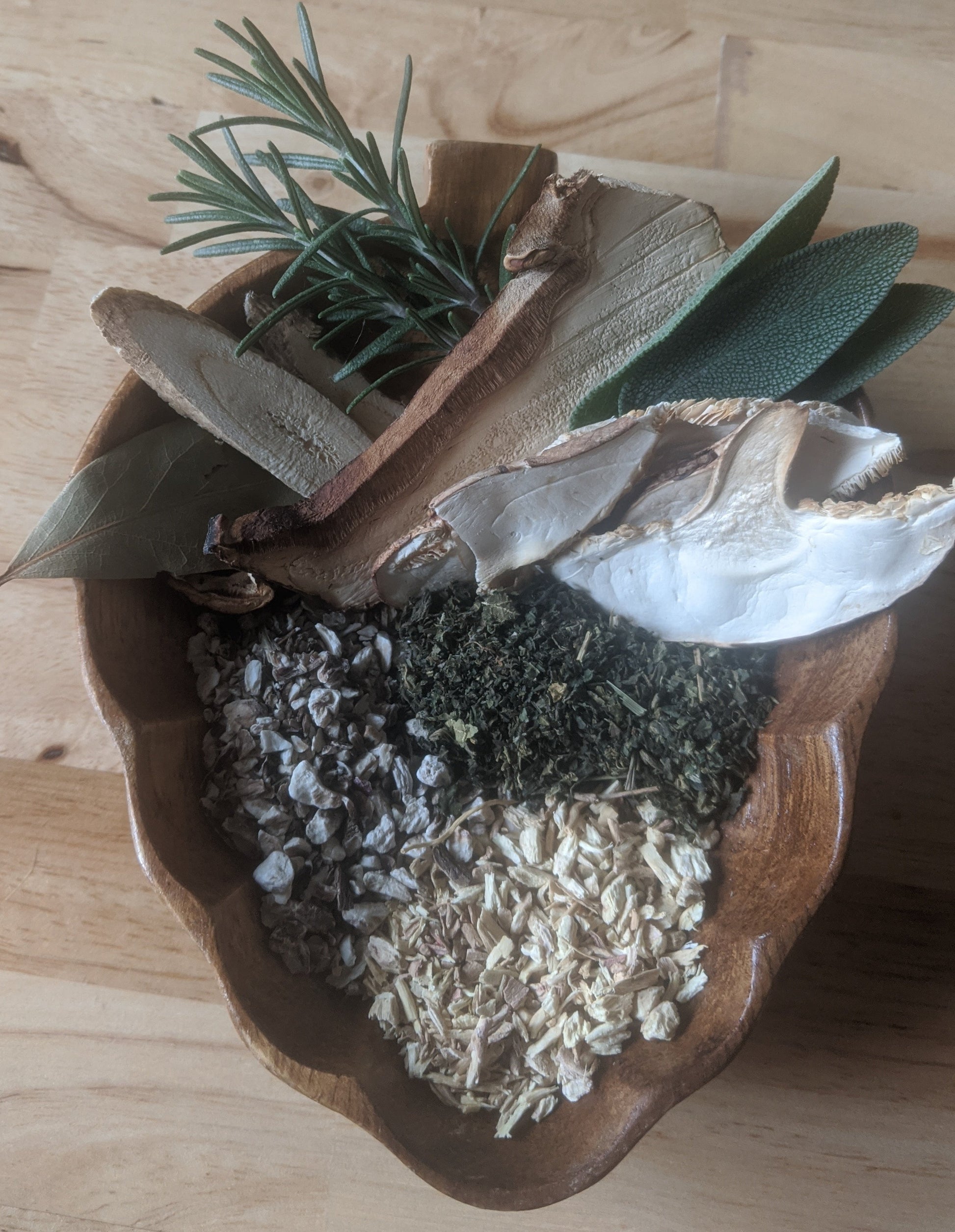 Ashwagandha root, burdock root, nettle leaf, astragalus root, reishi mushroom, shiitake mushroom, rosemary, sage, and bay leaf.